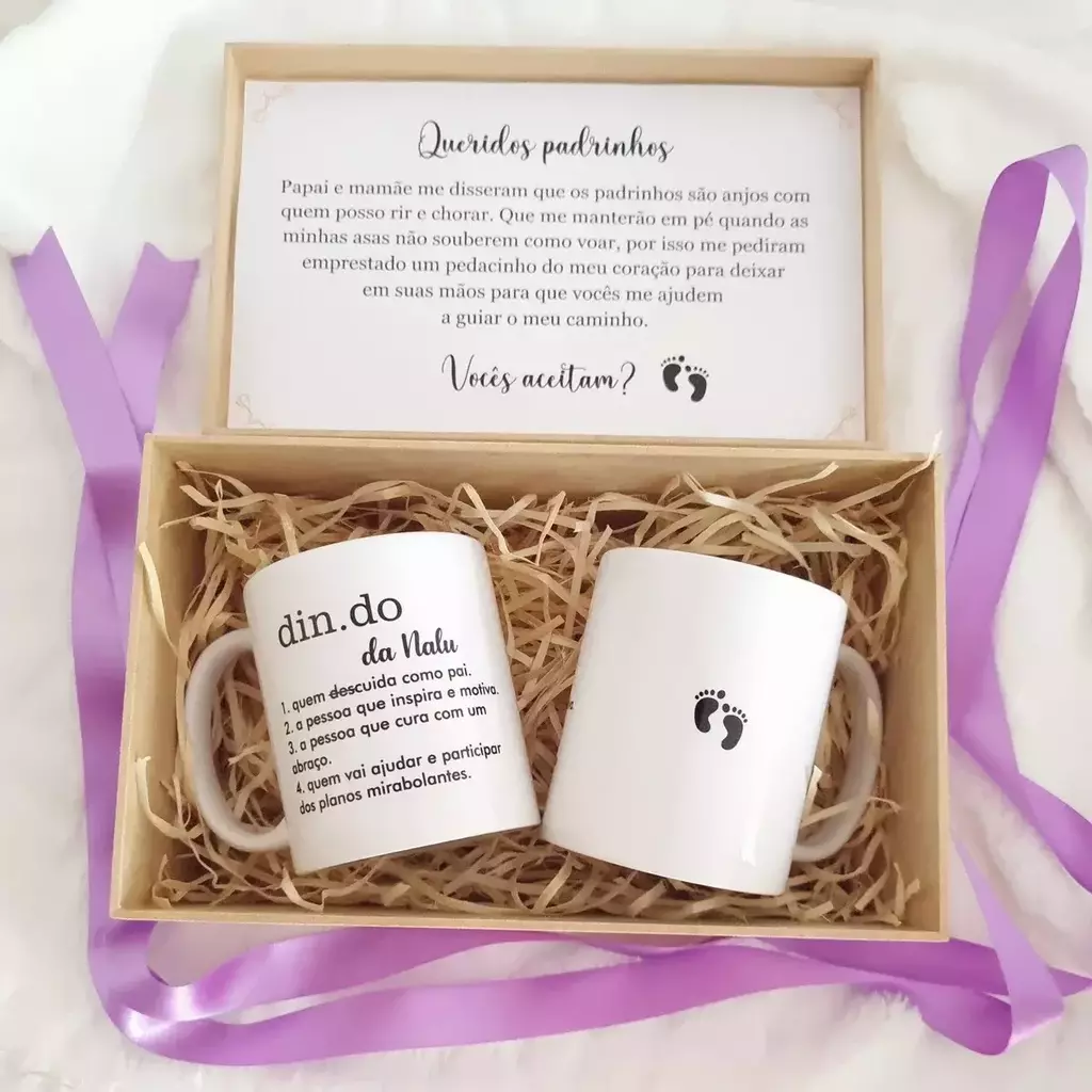 Estas canecas personalizadas são uma graça! Uma ótima ideia para convidar e presentear os futuros padrinhos do seu bebê, não é mesmo?